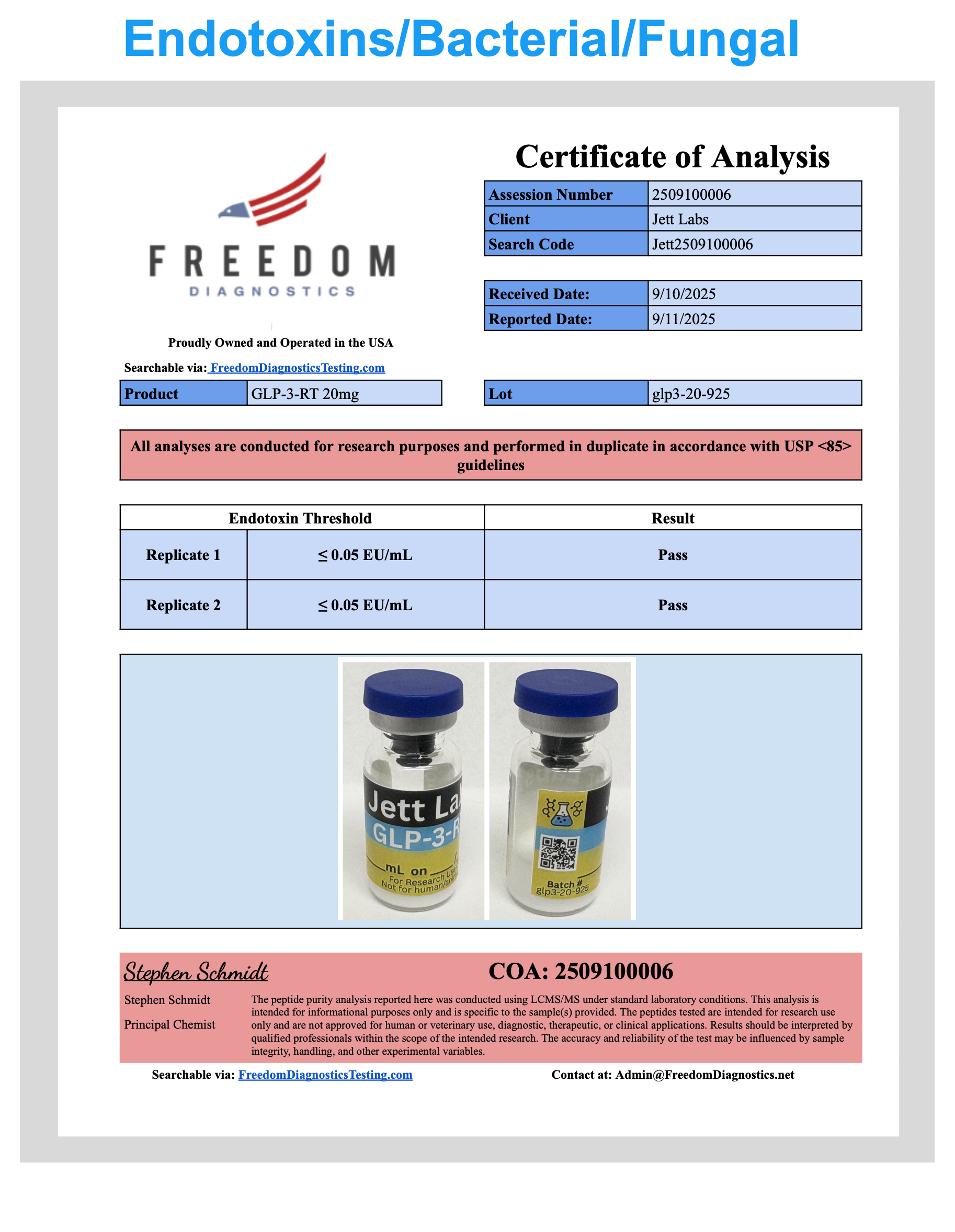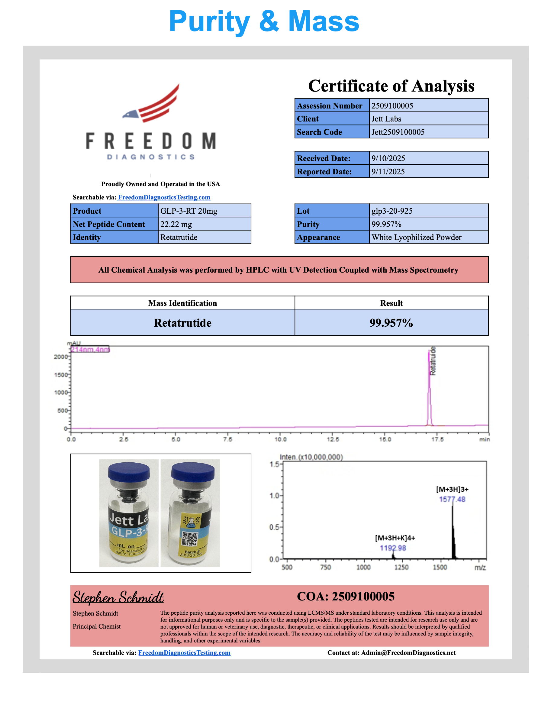 Each lot is analyzed by an independent laboratory using HPLC-UV/MS with mass-spectral confirmation to verify identity, purity, and net content. For lot glp3-20-925, purity is 99.957% with Retatrutide confirmed by mass identification; COA reports 22.22 mg net peptide content.